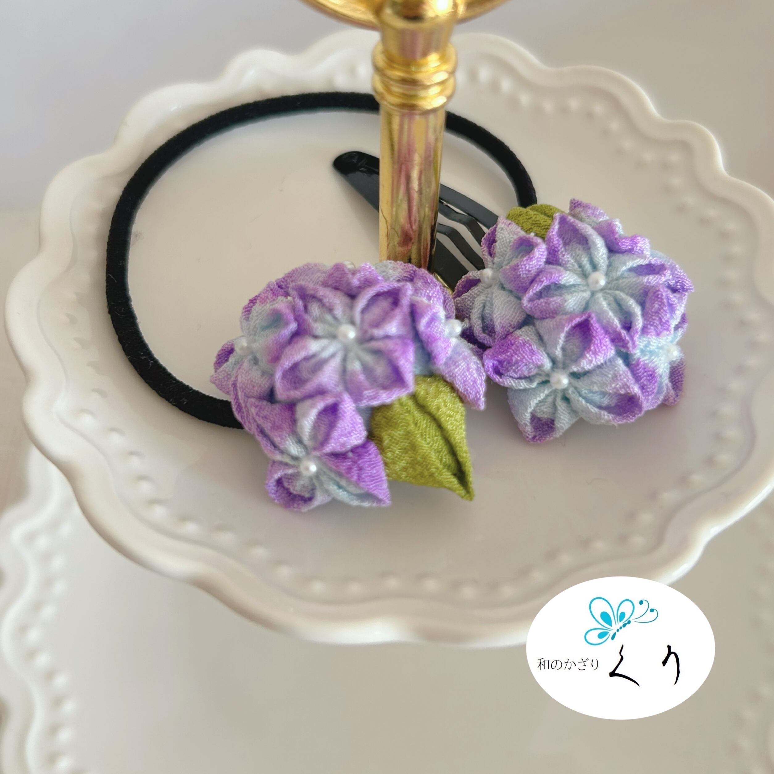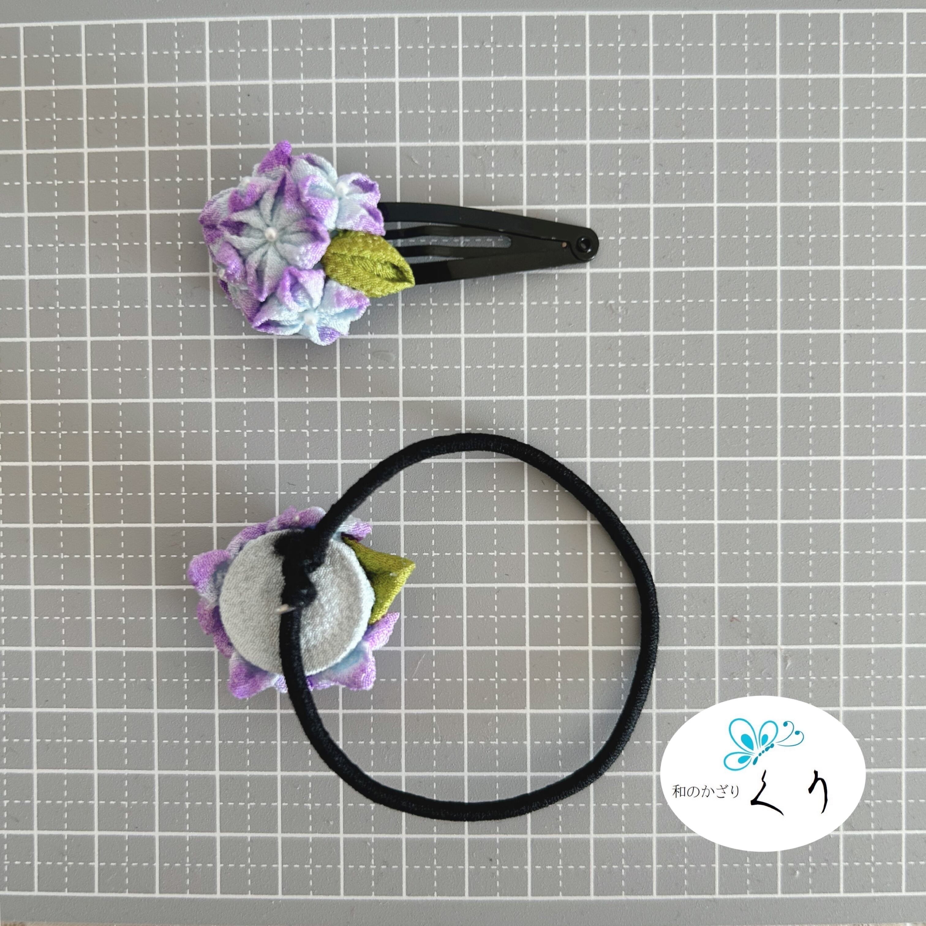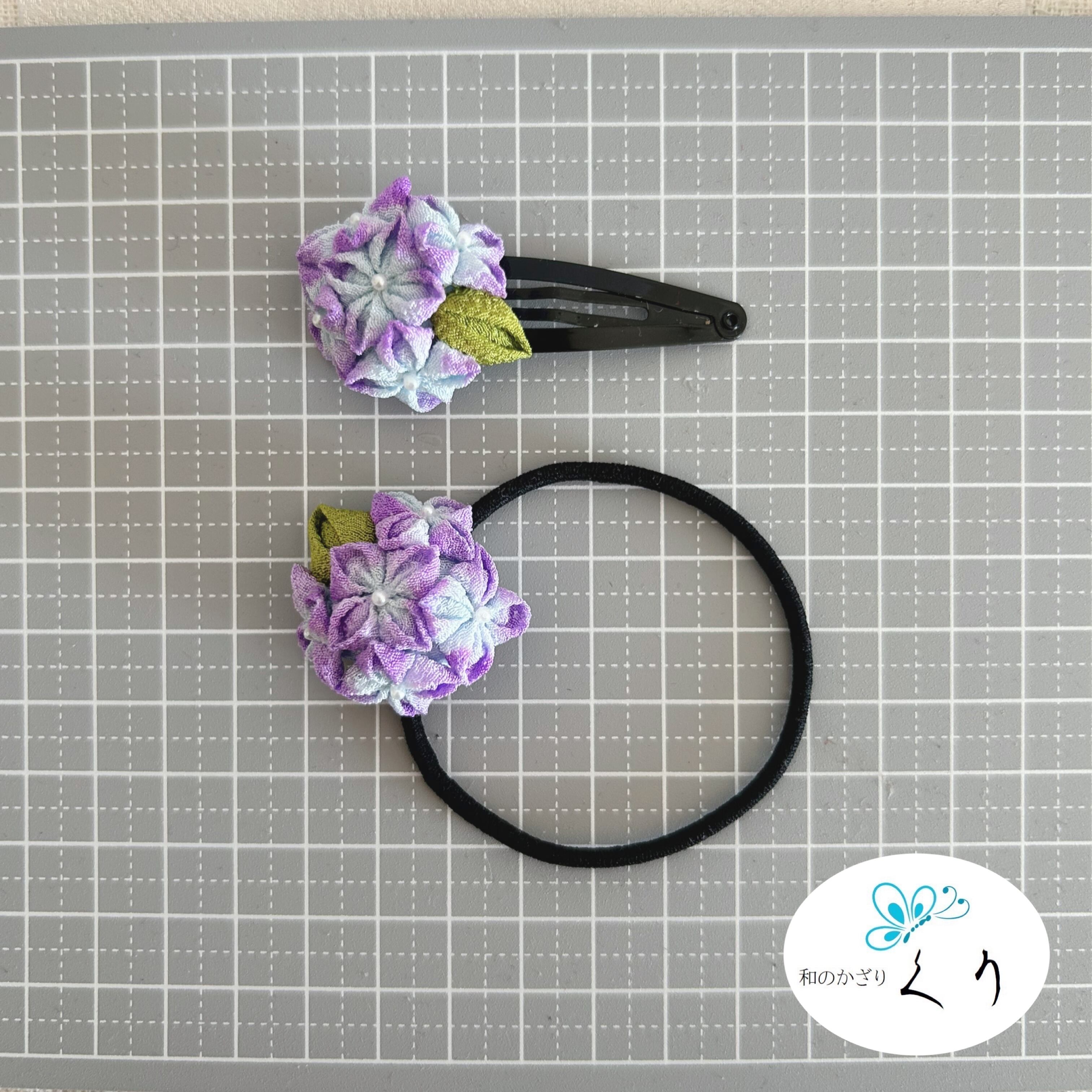 つまみ細工の紫陽花のヘアピンとヘアゴムです。