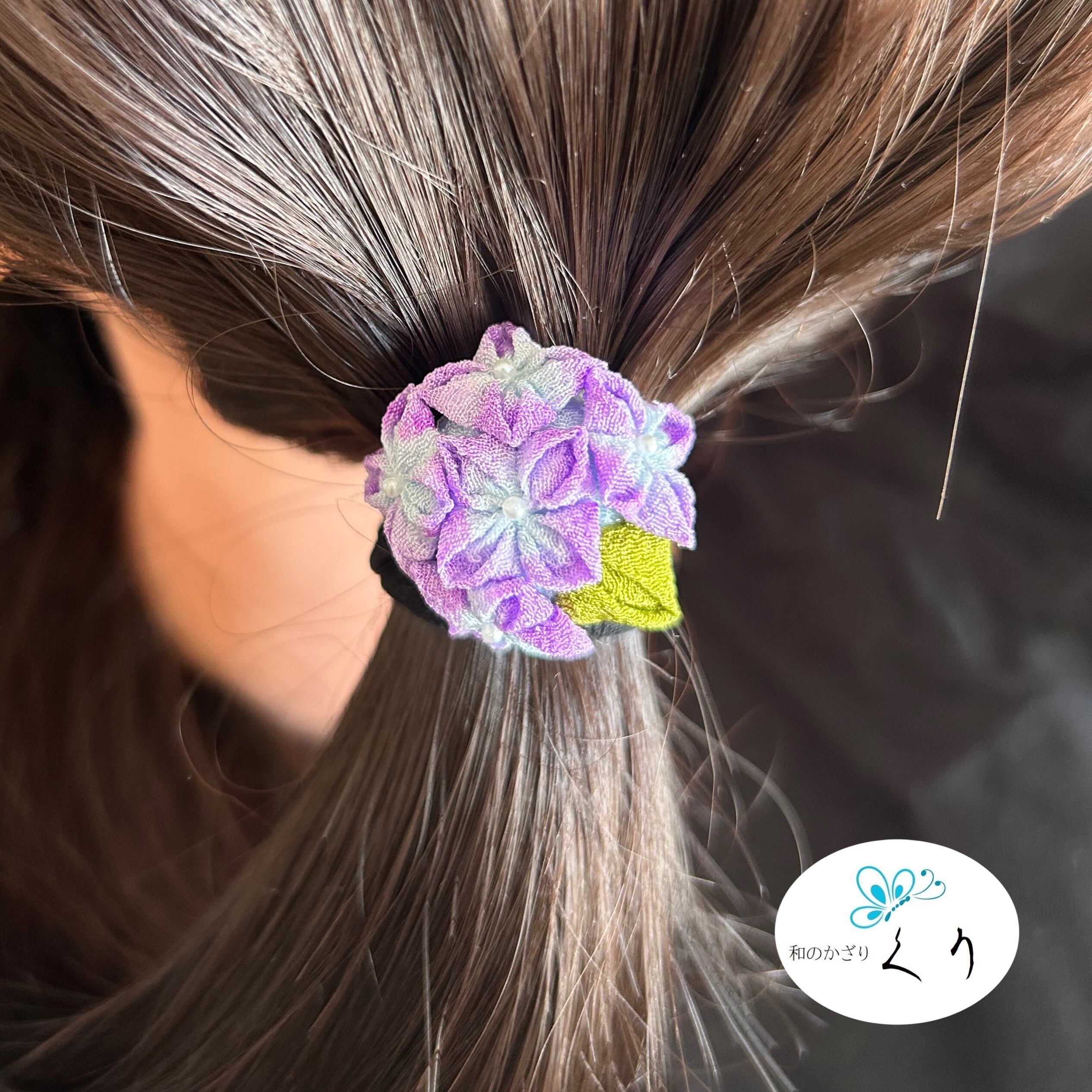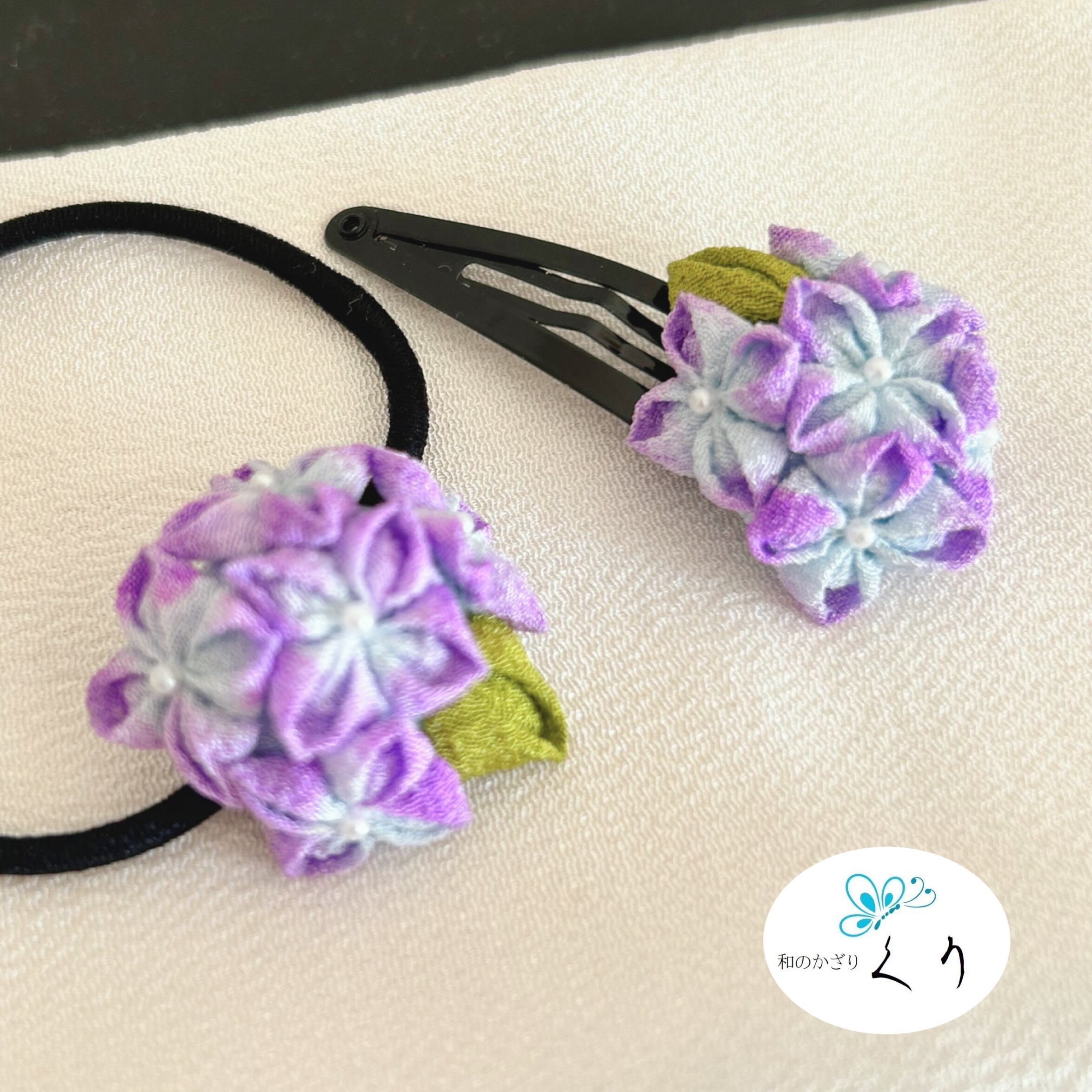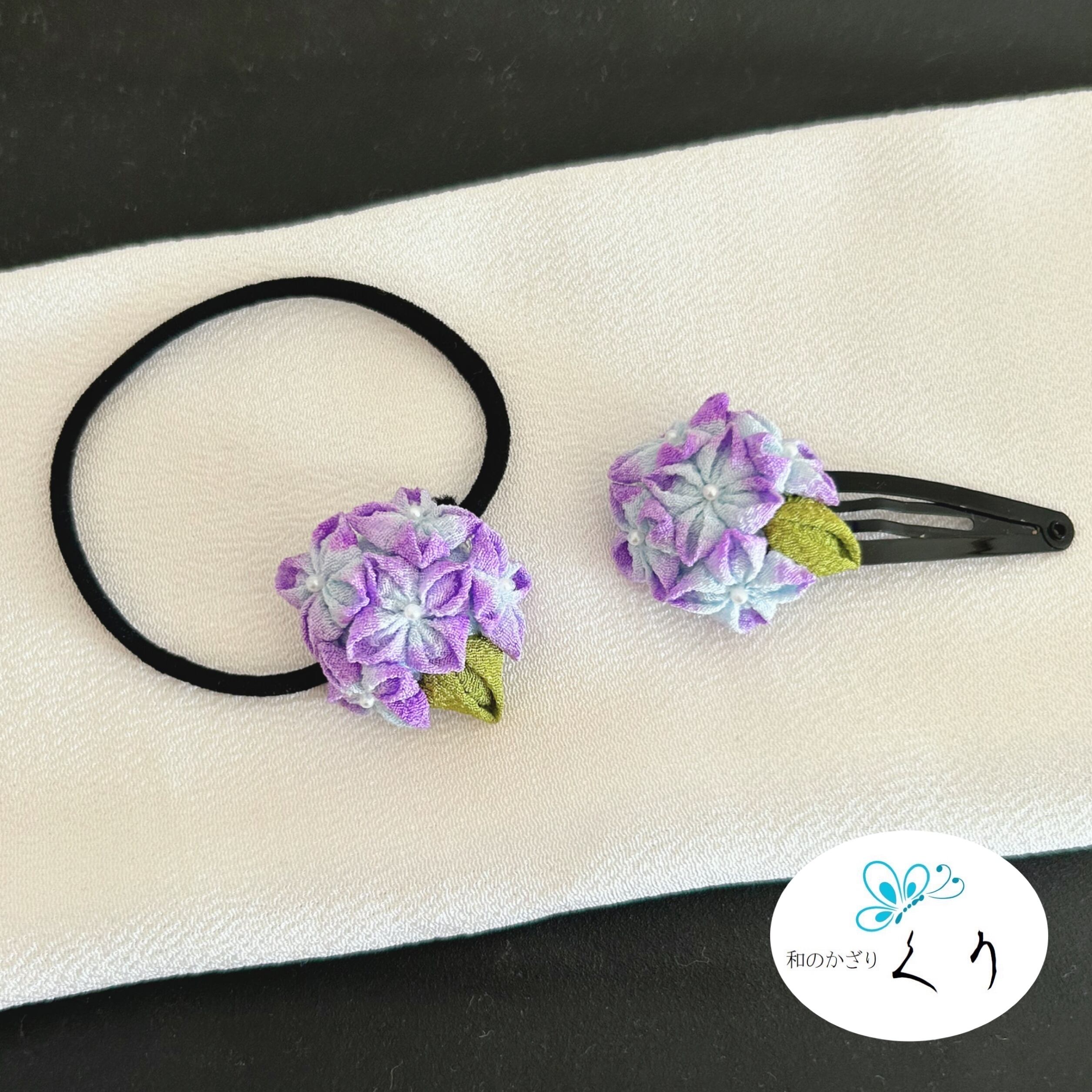 つまみ細工の紫陽花のヘアピンとヘアゴムです。